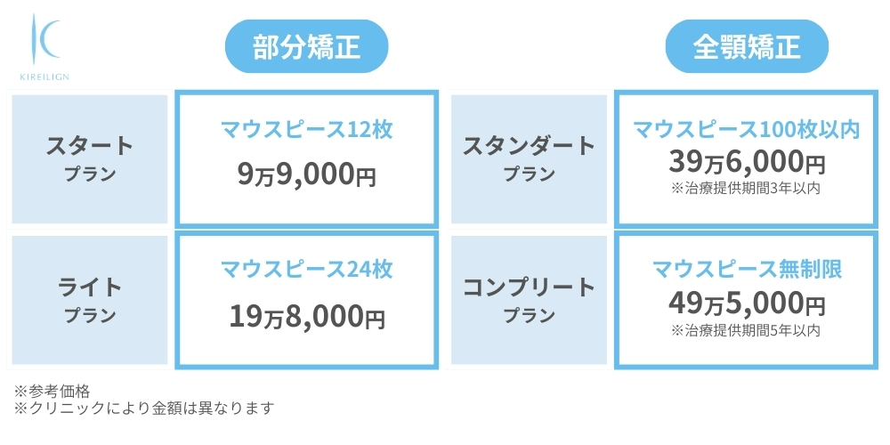 ※現在のプラン費用は参考価格です。キレイライン矯正の初診料・治療費用・再診料・追加治療費用はクリニックにより異なります。詳細は提携クリニックに直接ご確認ください。