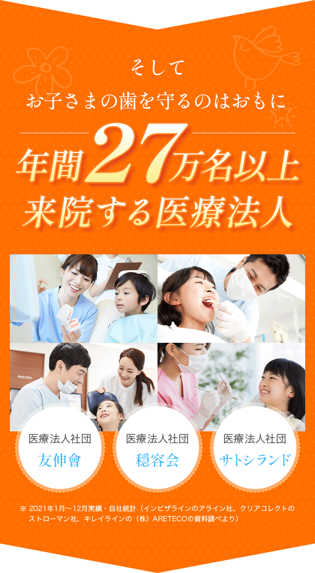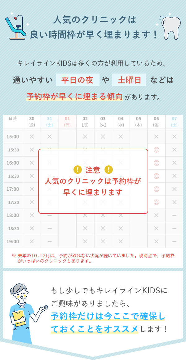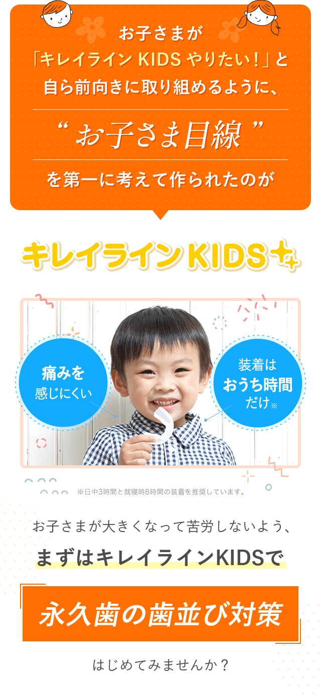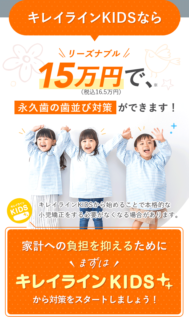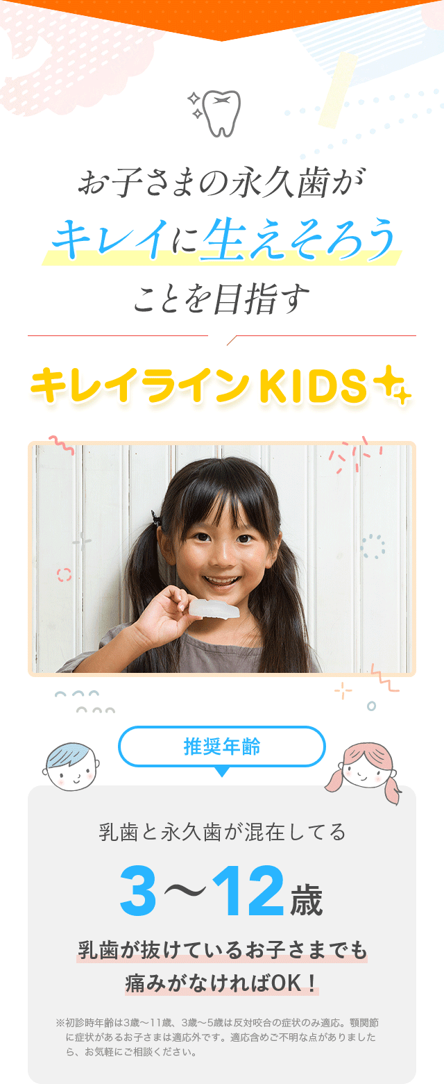 キレイラインKIDSの推奨年齢は3歳~12歳※です。 近い年齢で初回検診の受診を強く希望される場合は、予約フォーム内【その他・ご要望等】に記入のうえ、提携クリニックへご相談ください。