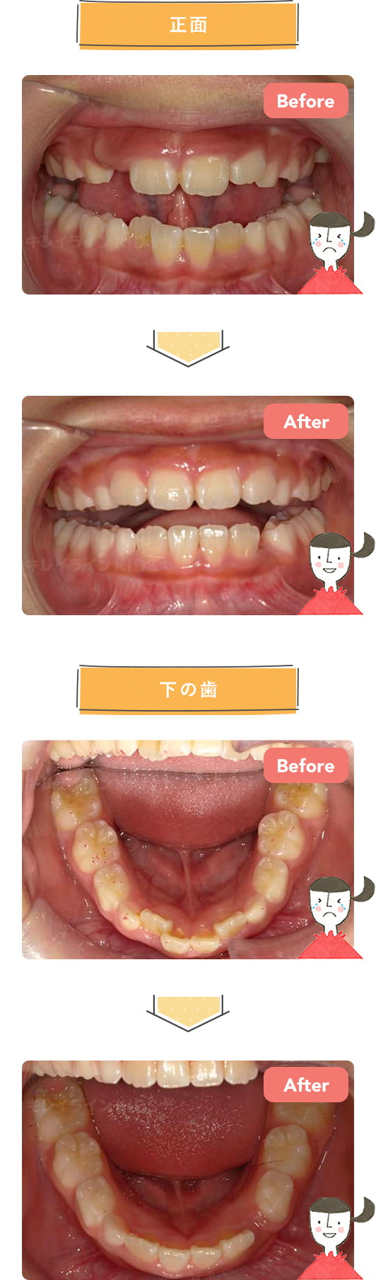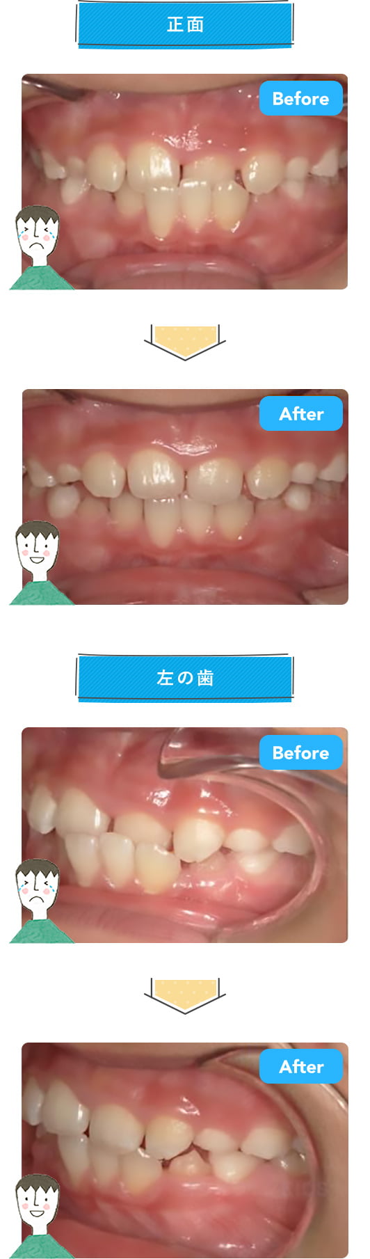 永久歯の生え揃っていない幼少期では、顎の骨格を整える治療が主体になります。この時期になるべく早く治療を開始することで、上下の顎のバランスや大きさを整えやすくなります。