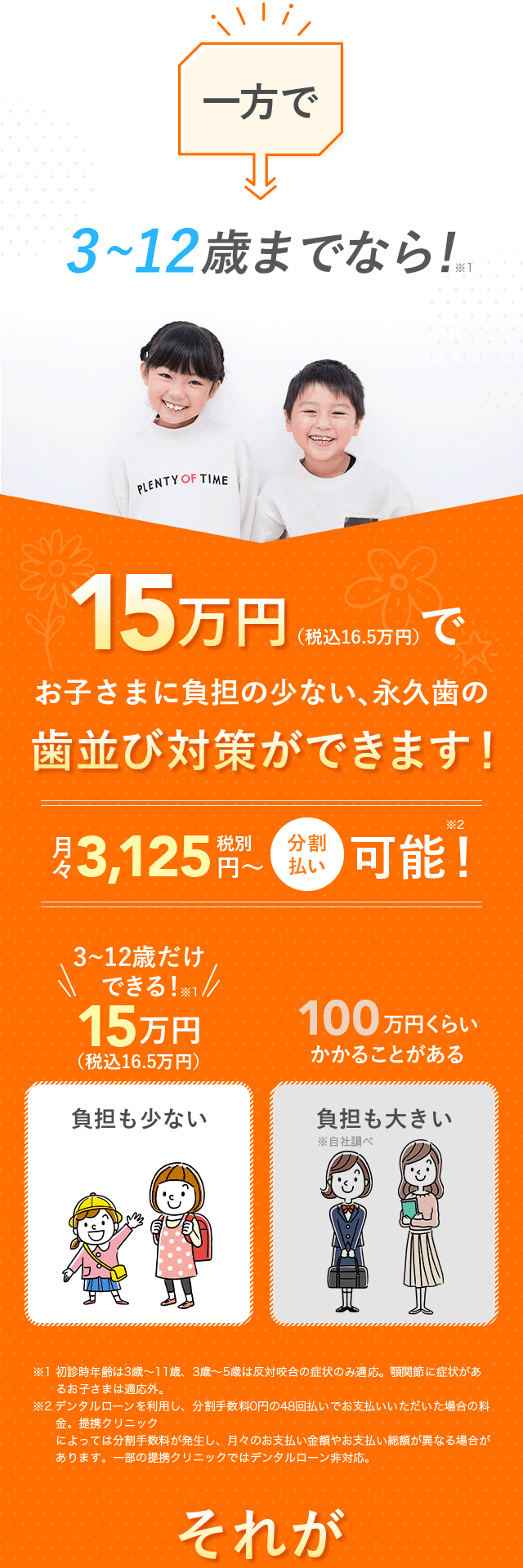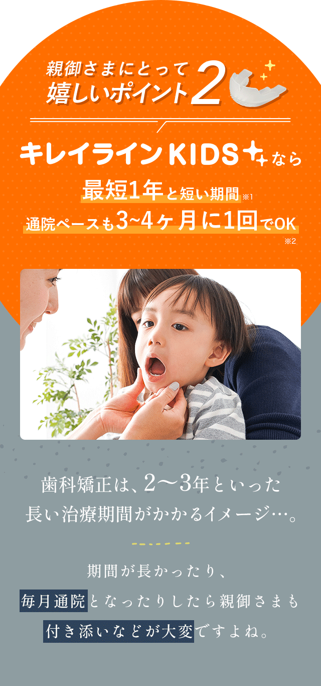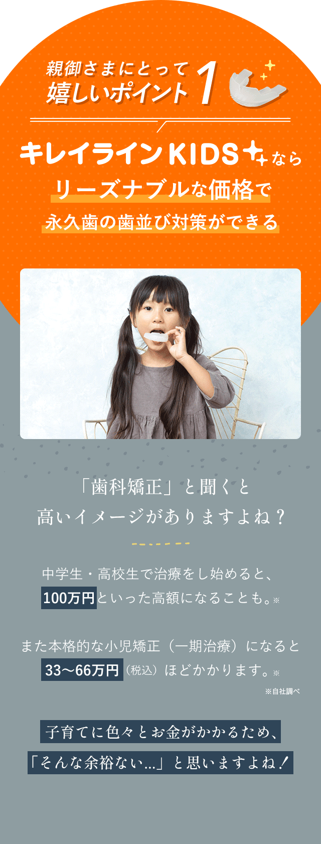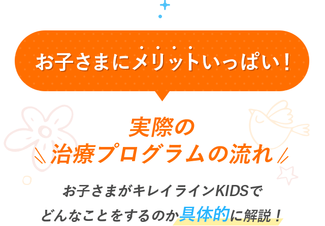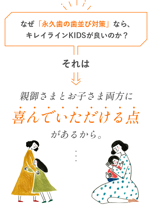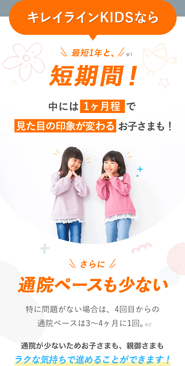 キレイラインKIDS推奨年齢※であれば、何歳からでも可能ですが、早めの治療開始をお勧めしております。より早く治療を開始することで、下記メリットをより多く受けることができます。