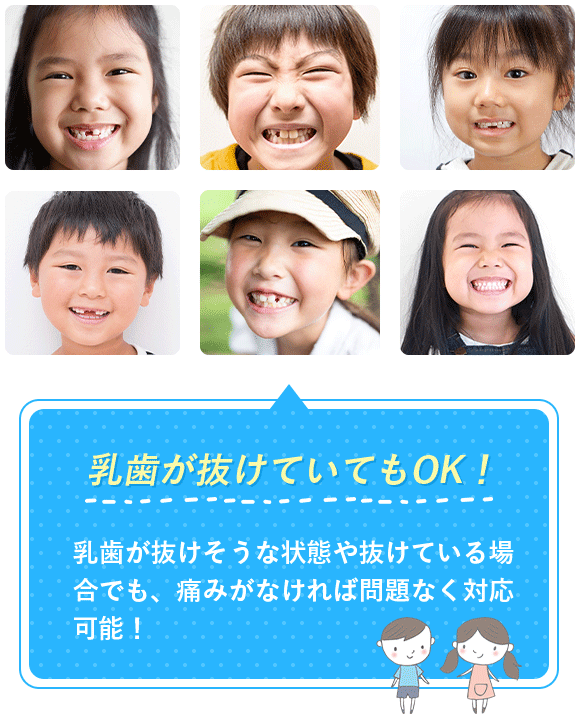 乳歯が抜けそうな状態や抜けている場合でも、痛みがなければ問題なく治療が可能です。