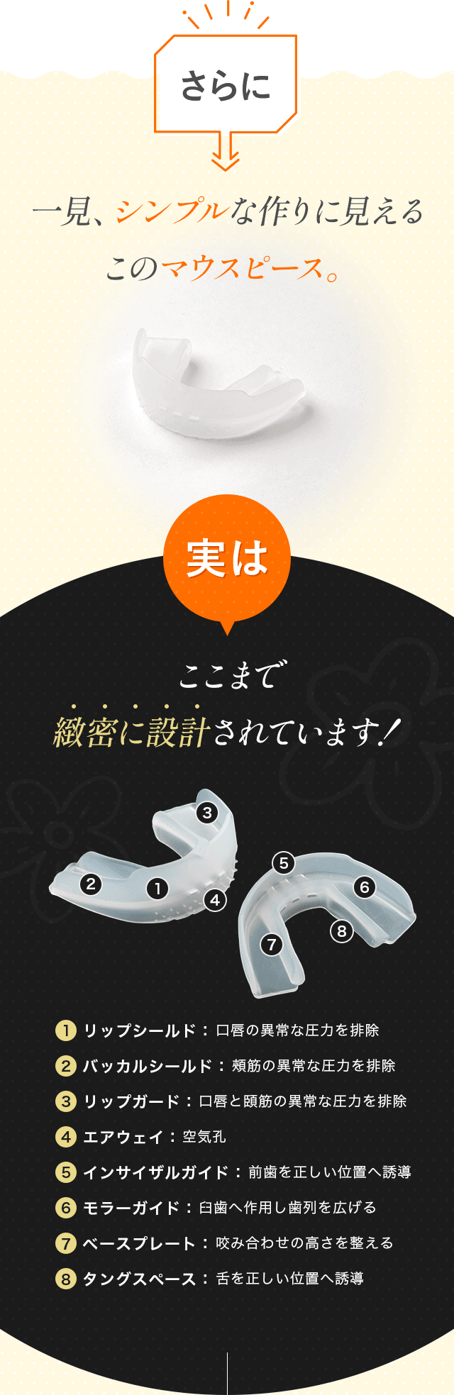 口腔周囲筋の正しい発達により鼻呼吸と口腔周囲の正常な機能が習慣づけられます。成長期におけるお子さまの、より健康的でバランスの良い顔貌の発達に繋がります。