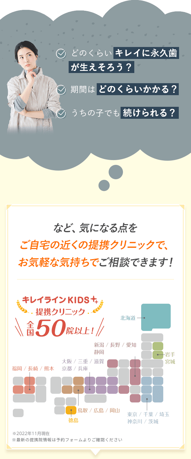 ただし、痛みがある場合や乳歯の抜歯をご希望の場合は、提携クリニックにご相談ください。