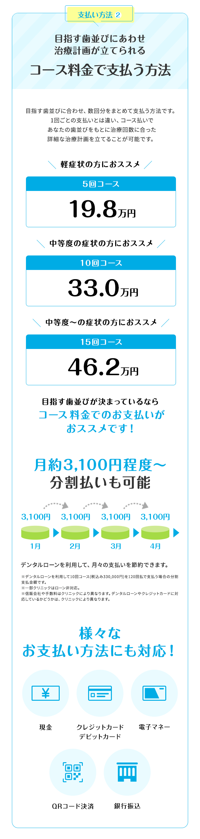 - ※2 デンタルローンを利用して10回コース(330,000円)を120回払いで支払う場合の分割支払金額です。