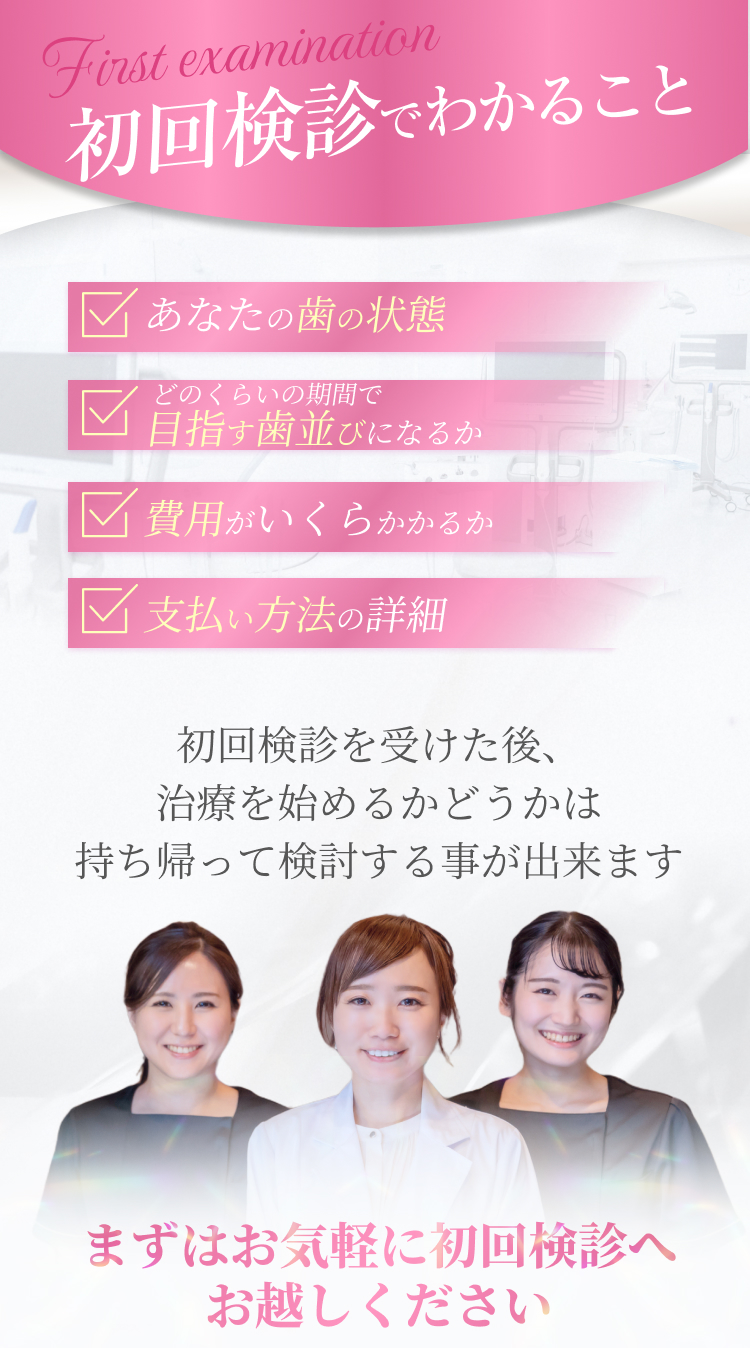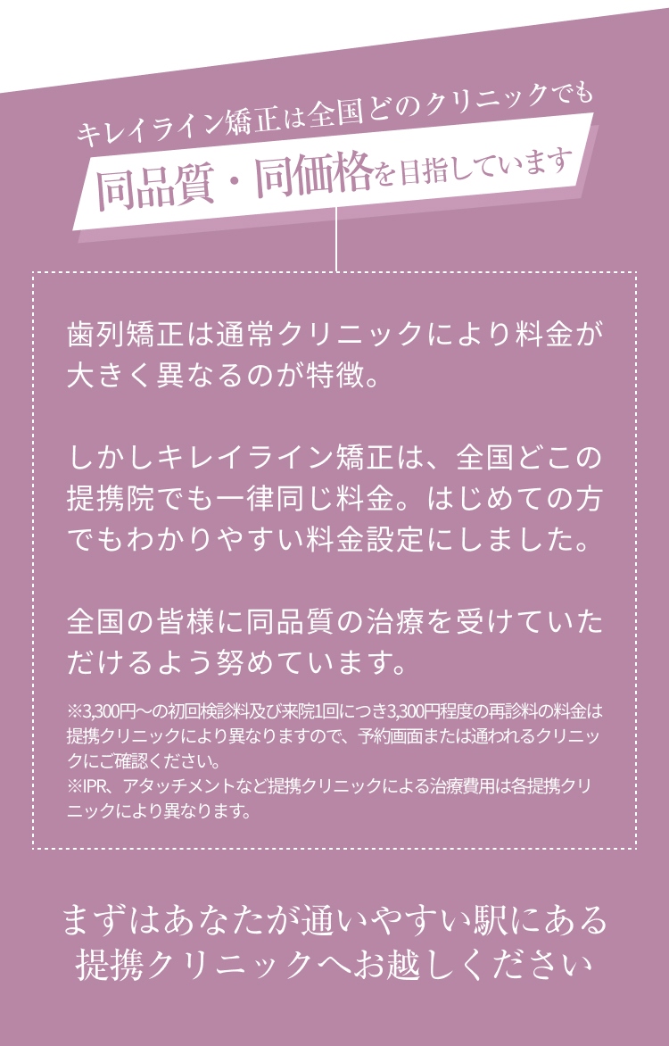 ※クレジットカード払い・デンタルローンは18歳以上(高校生を除く)が対象となります。 ※クレジットカード払い・デンタルローンに対応していない提携クリニックもございます。 ※初回検診以降は再診料として、1回の来院につき3,300円程度がかかります。契約方法・お支払い方法に関わらず、再診料はご来院ごとに提携クリニック受付にて現金もしくはクレジットカードでお支払いいただきます。 ※保定期間中の再診料は提携クリニックによって異なりますので、詳細は通われる提携クリニックへお問い合わせください。