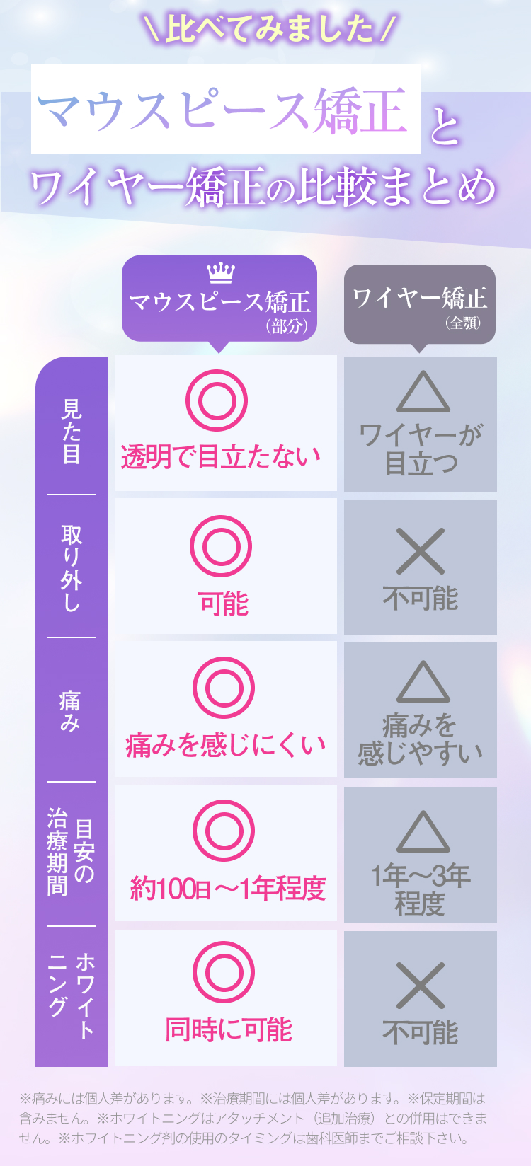 ※お食事・間食の際は、マウスピースの破損や汚れを避けるため必ず取り外してください。 ※1日4時間以内ならばマウスピースを外すことができますが、より矯正効果を実感するためには、1回あたりの外す時間をなるべく1時間以内に収めることがベストです。 -