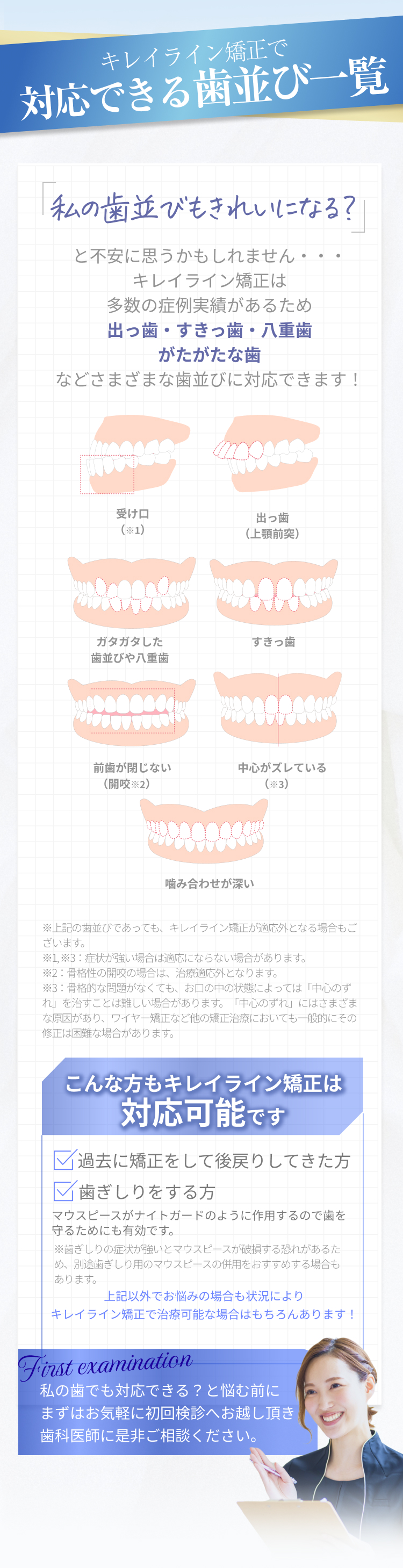 (後戻り・再矯正)でもできますか?もちろん過去に矯正経験がある方もキレイライン矯正を受けていただけます。 矯正終了後の後戻りは、初めての矯正歯科治療に比べて治療しやすい傾向にあります。 ただし、症状によってはキレイライン矯正が適応外となる場合もあるため、まずは初回検診にお越しいただき、歯科医師までご相談ください。