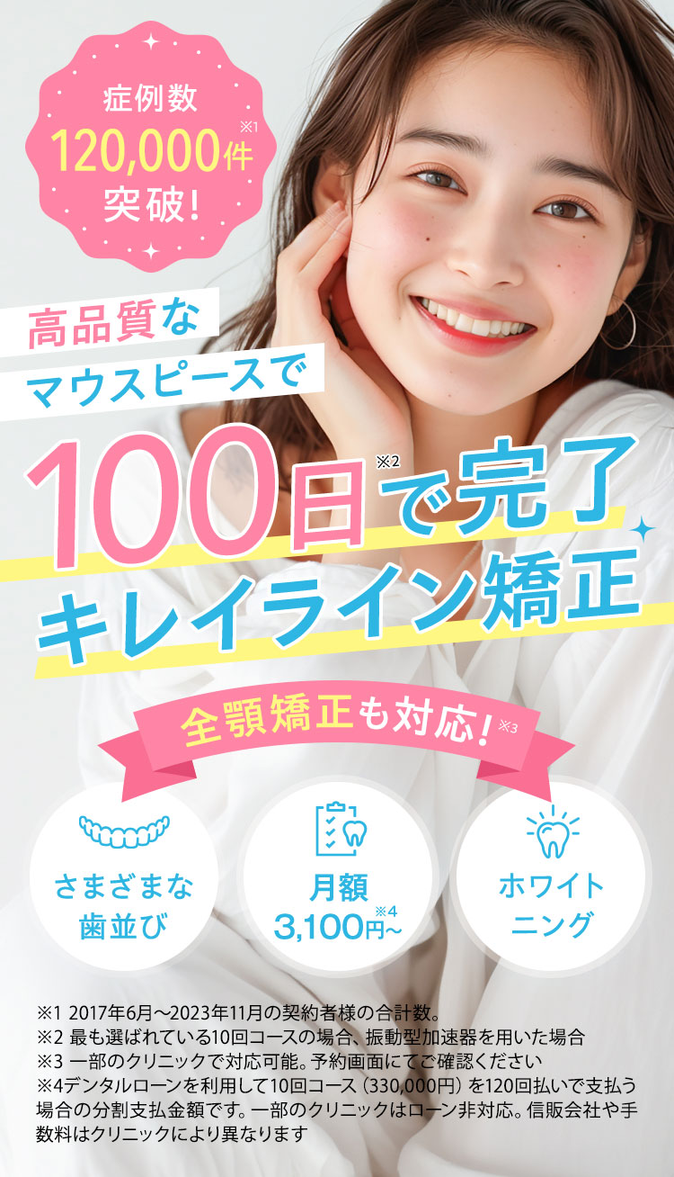 高品質な マウスピースで 100日で完了 キレイライン矯正 さまざまな 歯並び 初回検診 無料  ホワイト ニング