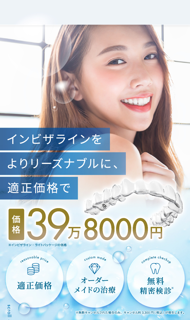 ※インビザライン・コンプリヘンシブパッケージの料金例。調整料などが別途かかる場合もあります。