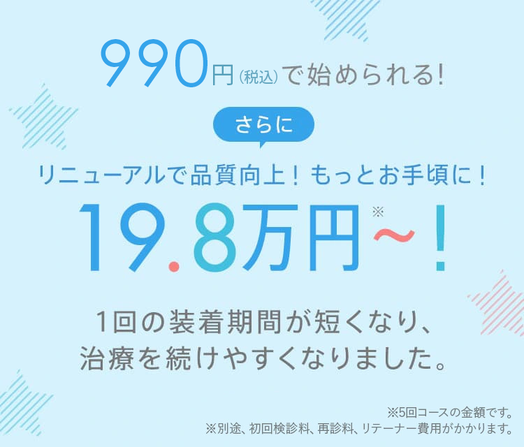 ※初回検診の結果、キレイライン矯正が適応とならなかった場合やご自身の判断で契約されなかった場合でも、初回検診料(3,300円~)は発生します。それ以外の費用は追加で発生しません。