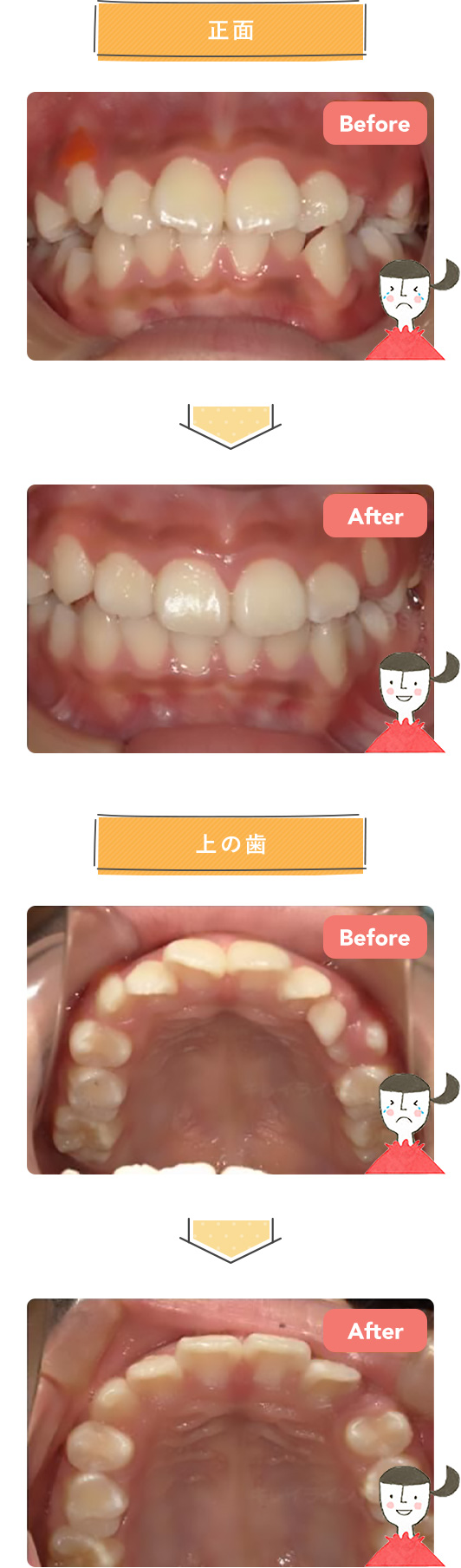 治療期間は1ヶ月半と短期間ではありますが、前歯の逆被蓋が改善され、上顎両側2番の萌出が顕著に認められました。下顎の叢生もきれいに改善されました。