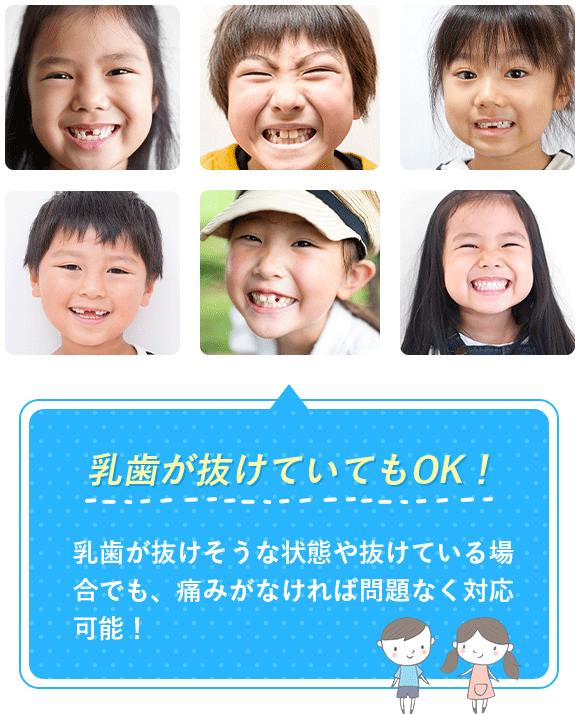 乳歯が抜けそうな状態や抜けている場合でも、痛みがなければ問題なく治療が可能です。