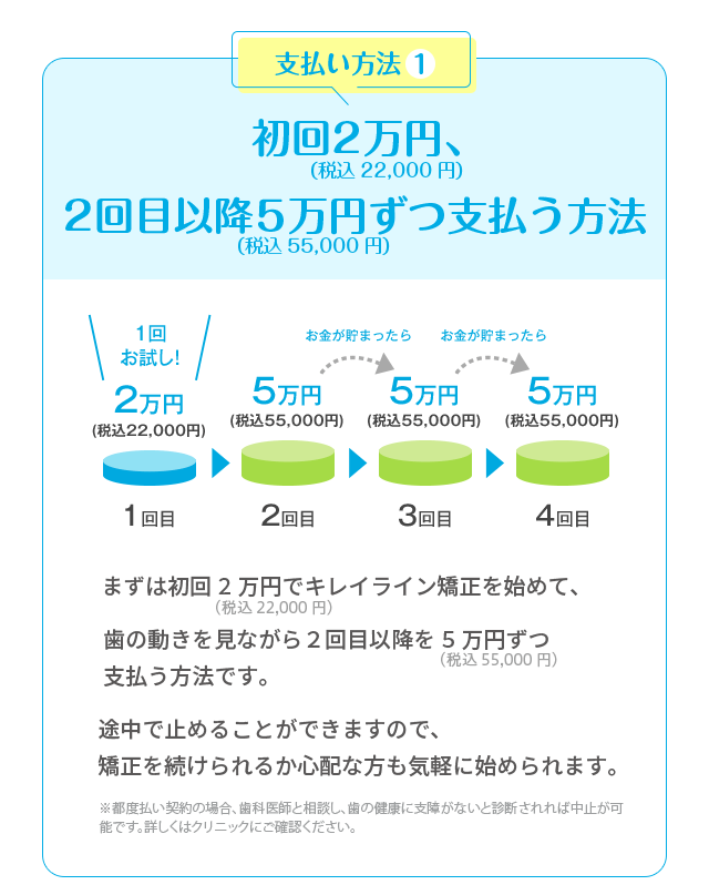 - ※クレジットカード払い・デンタルローンは18歳以上(高校生を除く)が対象となり、詳しい支払い方法や規約は各提携クリニックにより異なります。予約フォームの備考欄にご記載いただくか、初回検診にお越しの際にクリニックへご相談ください。
