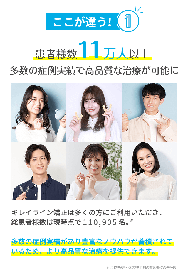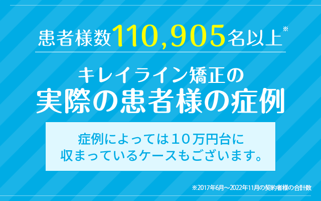- ※患者様の症状により、キレイライン以外の追加治療として片顎4万円(税込44,000円)の拡大床の併用やIPR、アタッチメントを歯科医師から推奨される場合があります。