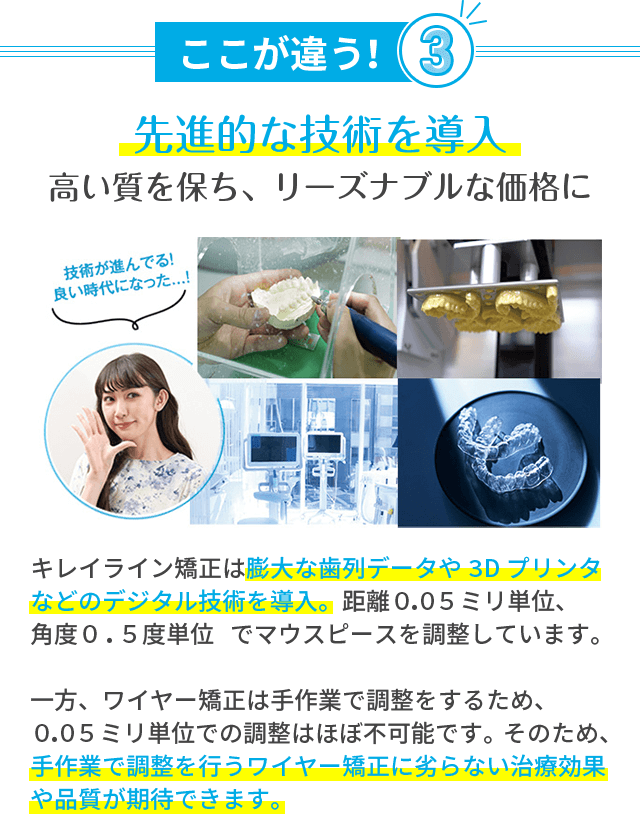 また、キレイライン矯正で使用しているマウスピースは、高精度な歯列デザイン技術を元に製造しており、的確な方向に力をかけて歯を動かせます。