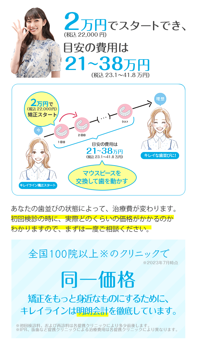 しかしキレイライン矯正は、全国どの提携クリニックでも一律同じ料金。はじめての方でもわかりやすい料金設定にしました。