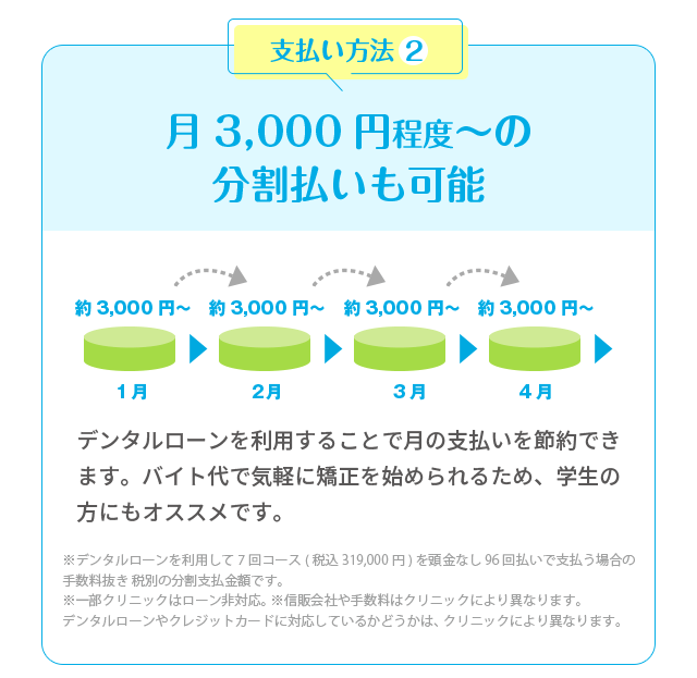 - ※1 デンタルローンを利用して7回コース(税込319,000円)を頭金なし・96回払いで支払う場合の手数料抜き・税別の分割支払金額です。