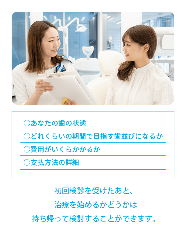 診査結果をもとに、歯科医師が何回の治療で、どの程度の歯並びになる見込みかなど、治療プランを丁寧に説明します。クリニックによっては歯並びの変化のシミュレーションもできます。