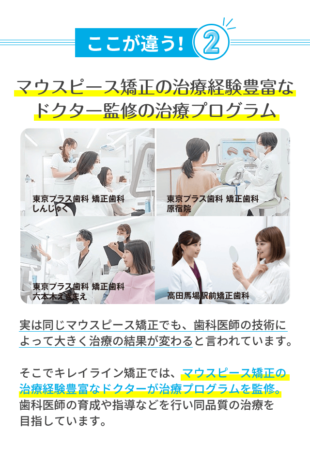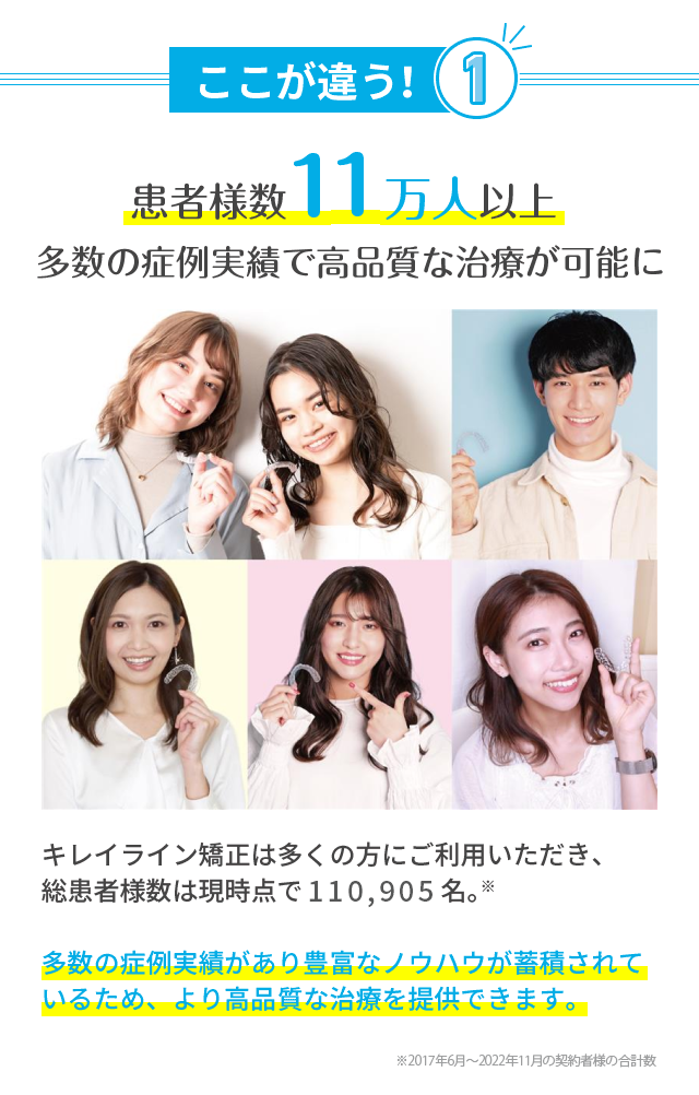 - ※4 高田馬場駅前矯正歯科の2019年11~12月の実績値。拡大床併用、IPR、抜歯など提携クリニックによる治療を含めた矯正歯科治療が対象。キレイライン矯正後にワイヤー矯正等の他の矯正治療に移行した患者様を含める。