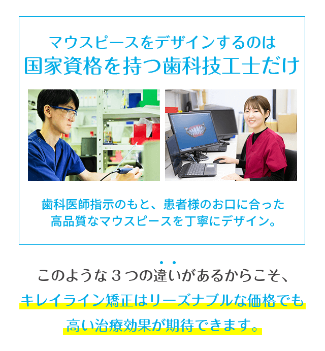 またキレイライン矯正のマウスピースを歯科医師の指示のもとデザインするのは、『日本の国家資格を持つ歯科技工士』です。