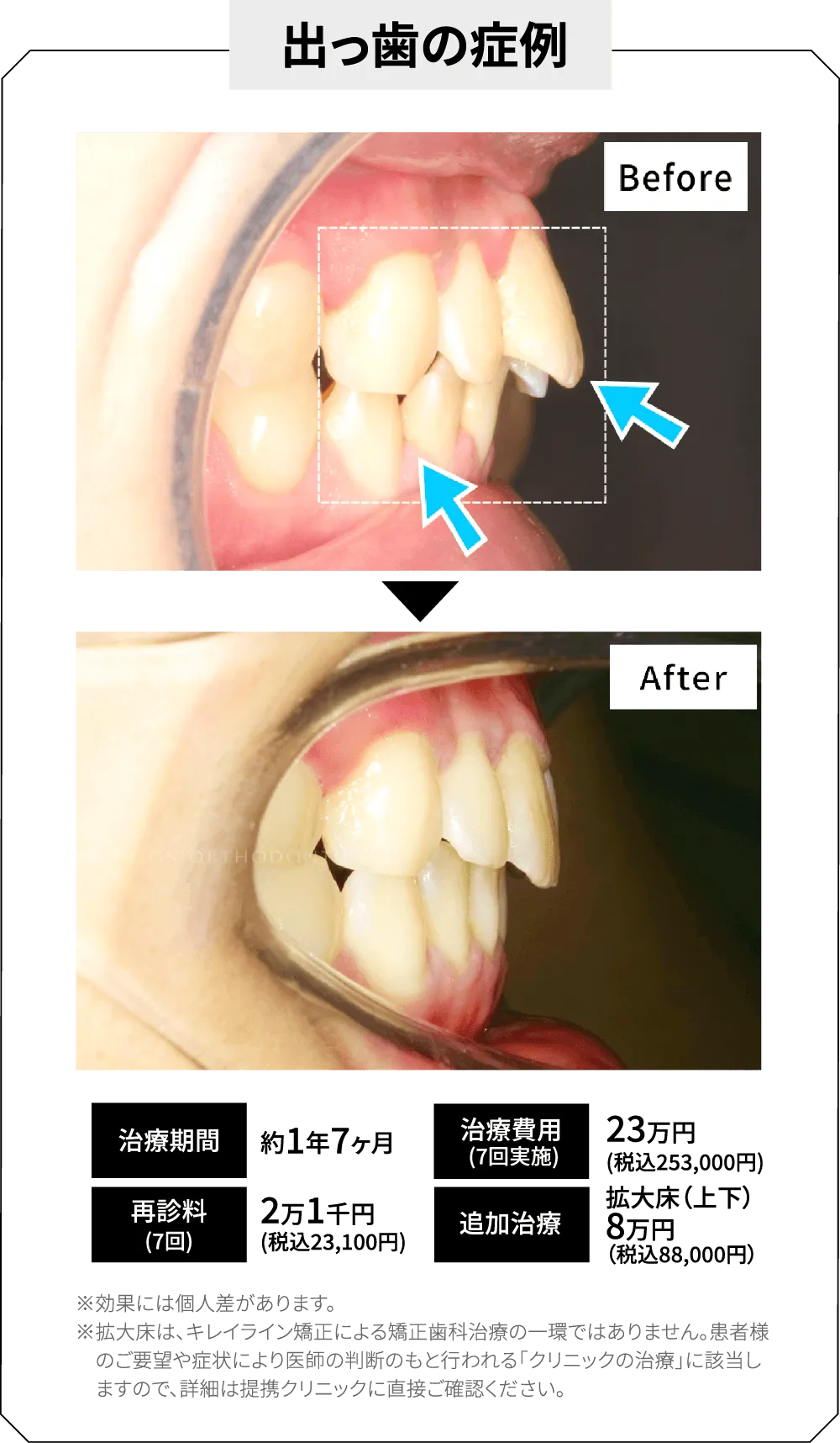 ※抜歯・拡大床・IPR(削る処置)はいずれもキレイライン矯正による治療の一環ではなく、提携クリニックによる治療です。詳細はクリニックへお問い合わせ下さい。