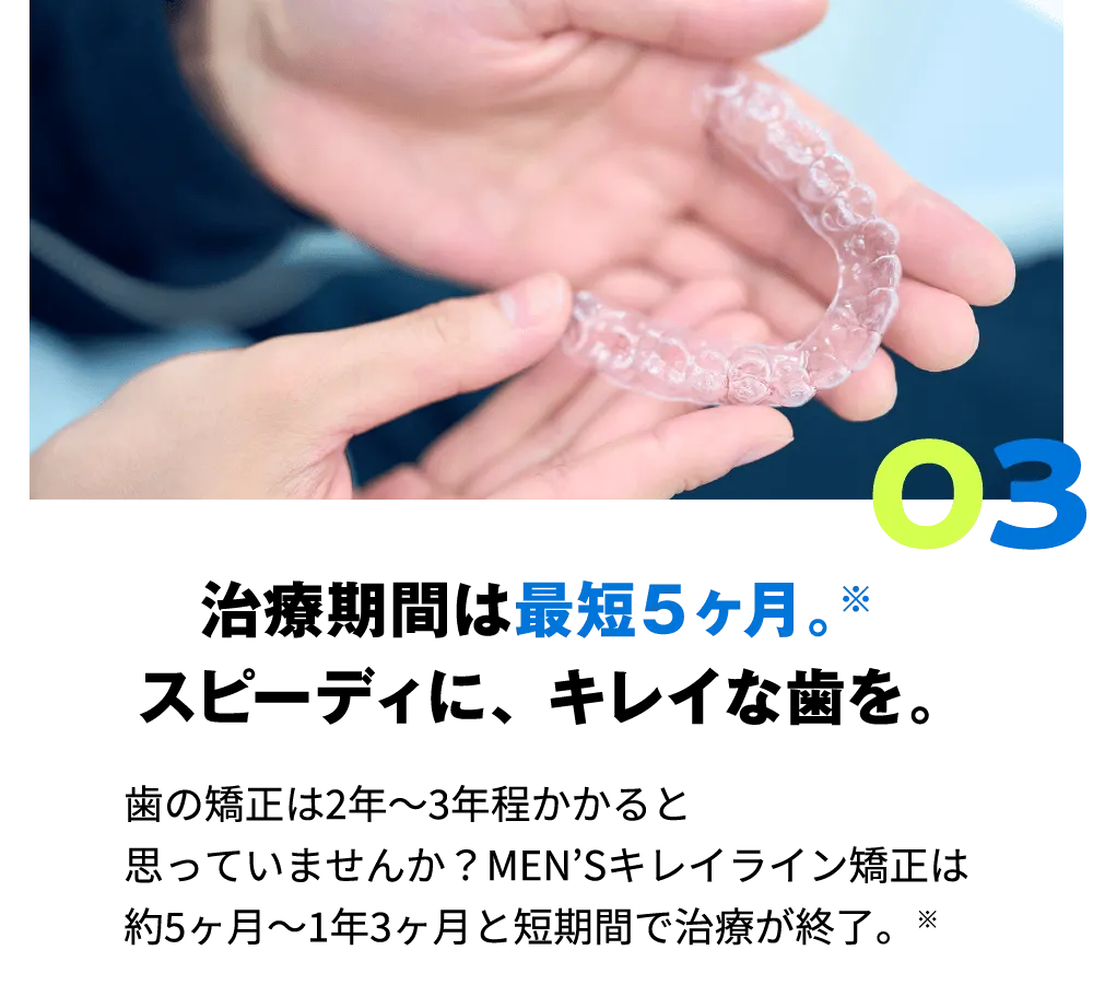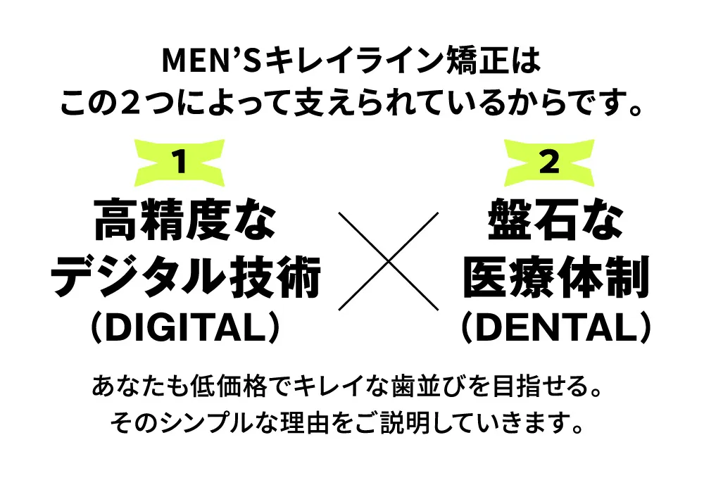以上が、MEN’Sキレイライン矯正が低価格でも高い効果を期待できる理由です。高いデジタル技術と信頼の医療体制によって、あなたが望むキレイな歯並びに近づけていきます。