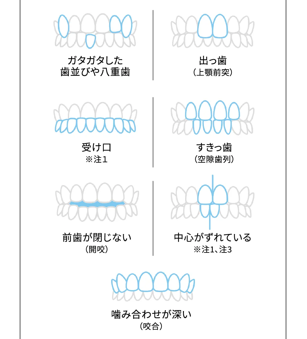 「歯並びが悪いとマウスピース矯正ができないのでは?」というイメージがあるかもしれませんが、多くの方がキレイライン矯正でキレイな歯並びを目指せる症状です。