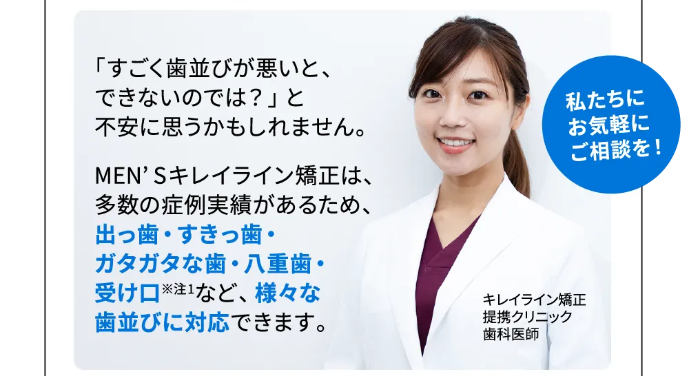 MEN’Sキレイライン矯正は、マウスピース矯正の治療経験が豊富な歯科医師が治療プログラムを監修。提携院も日本全国50以上あり、多数の症例実績があります。