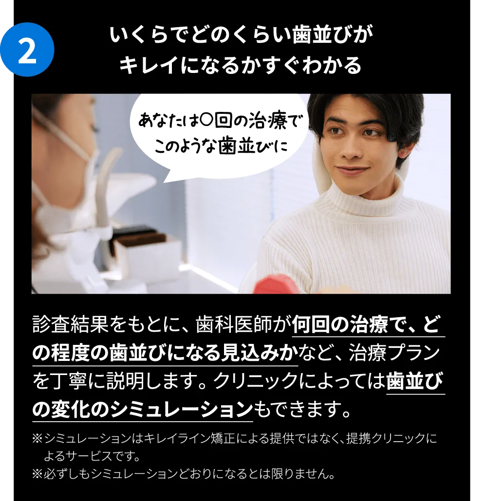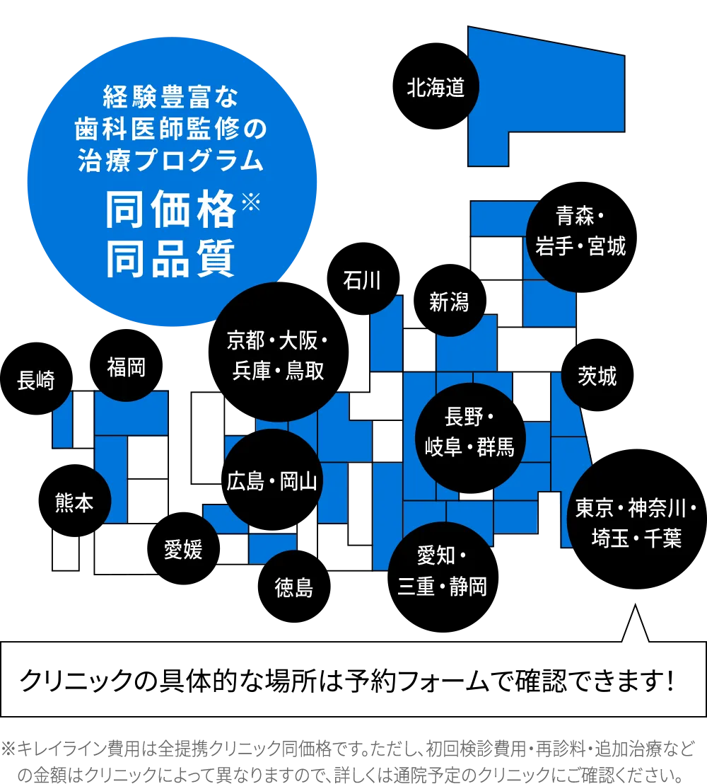 ※抜歯・拡大床・IPR(削る処置)はいずれもキレイライン矯正による治療の一環ではなく、提携クリニックによる治療です。詳細はクリニックへお問い合わせ下さい。