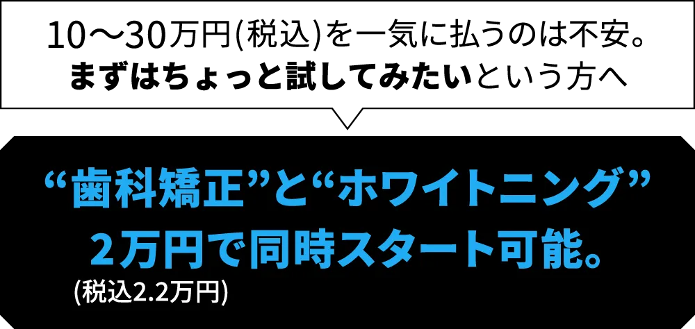 ※月々約3,000円〜(税別)はデンタルローンを利用して、7回コース(税込319,000円)を頭金なし・96回払いで支払う場合の手数料抜き・税別の分割金額です。一部のクリニック除く。信販会社や手数料はクリニックにより異なります。