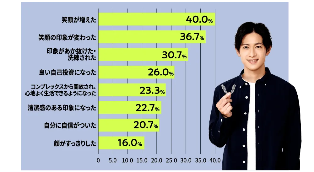 歯を見せて気持ちよく笑うこともでき、「清潔感があって、笑顔が素敵な男性だな」「明るい雰囲気の人だな」と、今よりもっと周りから良い印象を持ってもらえるでしょう。