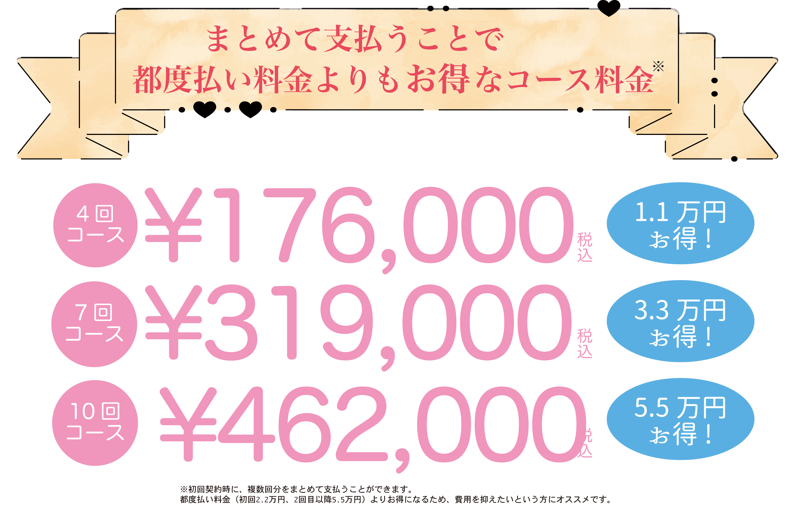 です。1回ずつ購入したい場合は、初回のみ2万円(税込22,000円)・2回目以降5万円(税込55,000円)です。コースを組み合わせた