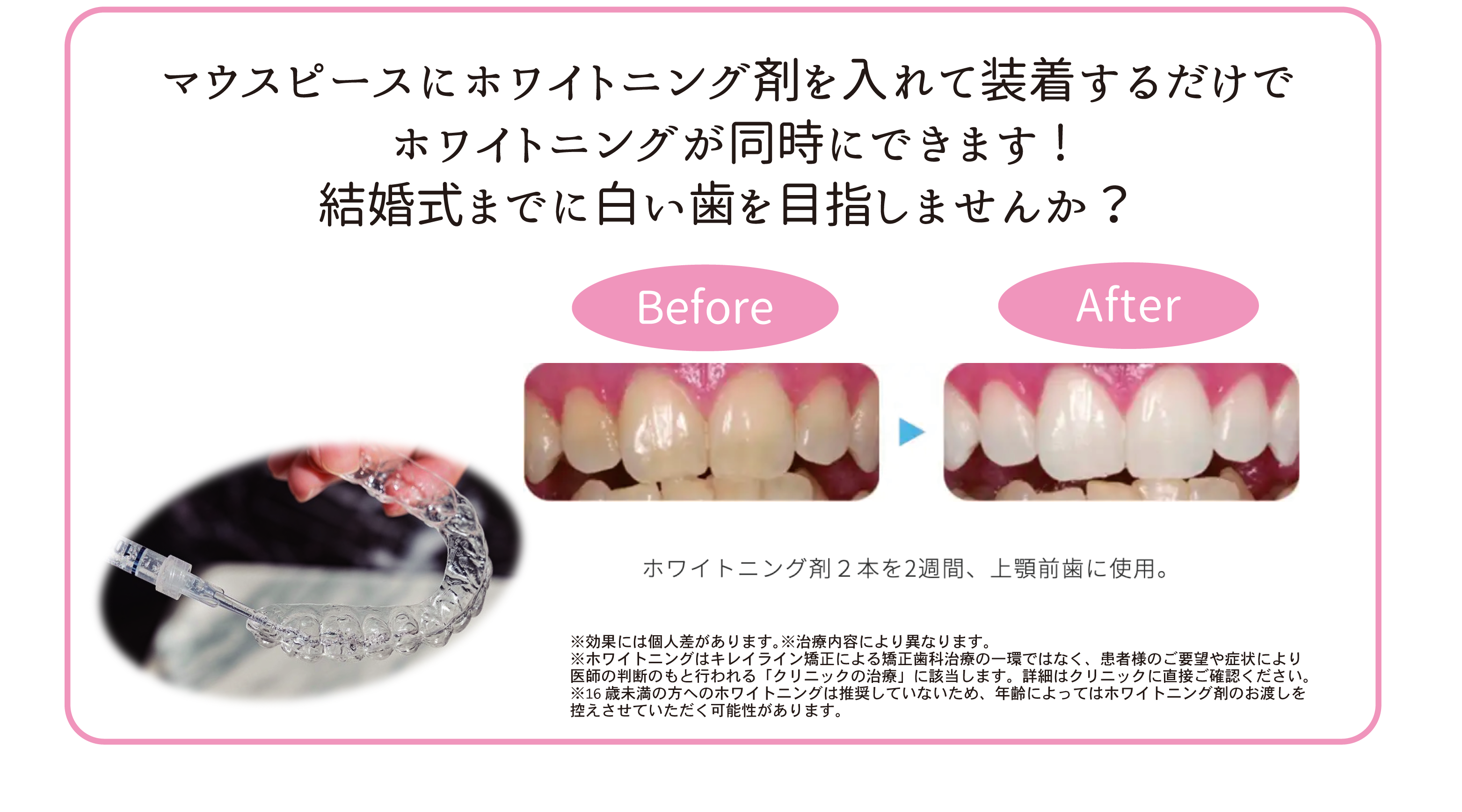 ・キレイライン矯正をご契約いただいた場合、ホワイトニング剤最低1本が料金に含まれます。2本目以降はクリニックによって費用が異