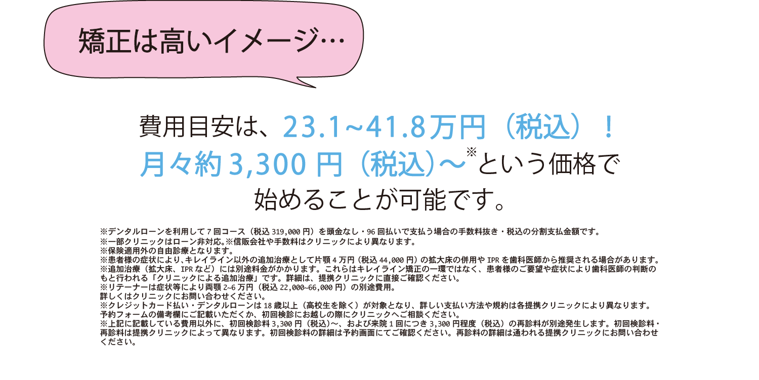 ・初回検診料3,300円(税込)~、およびリテーナー費用22,000円~66,000円(上下・税込)が別途発生します。